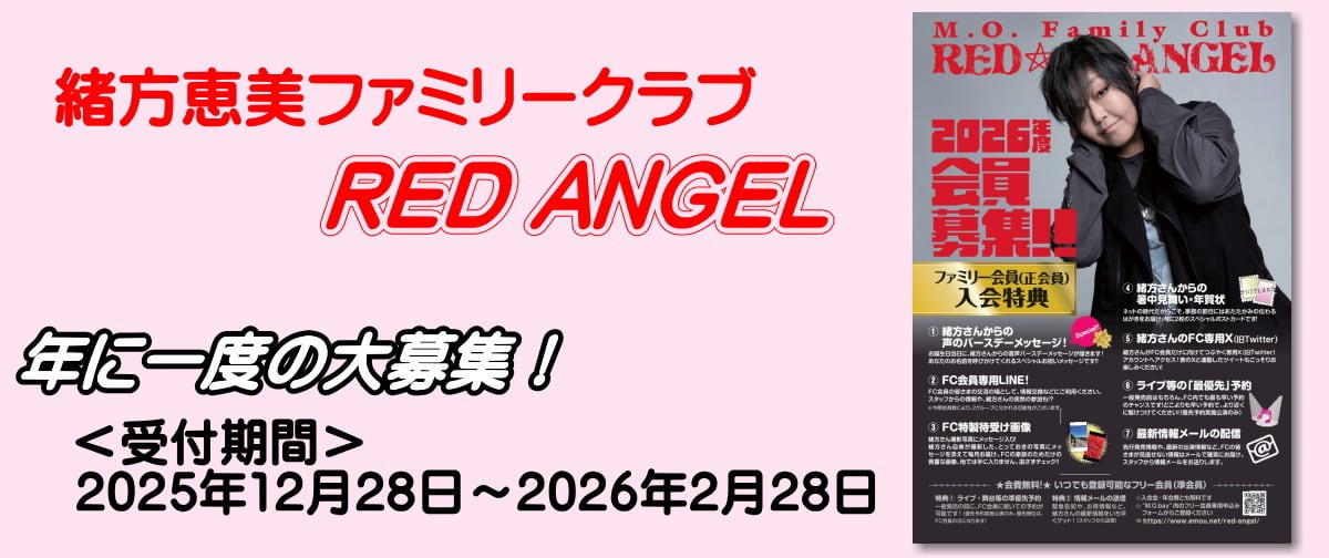 緒方恵美FC RED☆ANGEL2026年度会員募集! ※新規お申込みの方はこちらをご利用ください ライブチケット優先予約はもちろんのこと、 本人撮影の特製携帯待受け画像や、ネットの時代だからこその 季節のおはがきの送付など特典は一年を通して盛沢山! FC専用 X(Twitter)では会員のみのここでしか聞けないコッソリのお話しも! そして!一番のおススメは皆さまからご好評をいただいておりますスペシャル特典! お誕生日にあなたのお名前を呼びかけるお祝いメッセージ送信サービス。 緒方さんから直接お祝いしてもらえます♪ 申込期間は12月28日~2月末まで。 募集はこの期間内のみとなりますので、ぜひこの機会をお見逃しなく!